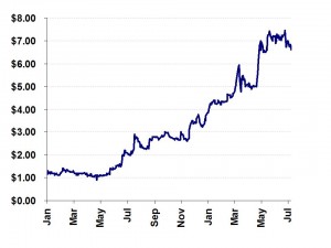 The stock has had a very good run this year, doubling from $3.84 to over $7.00 in June. Part of the run has been due to the company’suplisting to the NASDAQ in April. Prior to April, the company had been a relatively illiquid micro cap on the OTCBB. This event saw the share price immediately pop by nearly 40% from its then price of $5.00 to over $7.00. It is almost always the case that small OTC companies will experience a brief pop following their uplist to the mainstream NASDAQ.