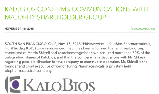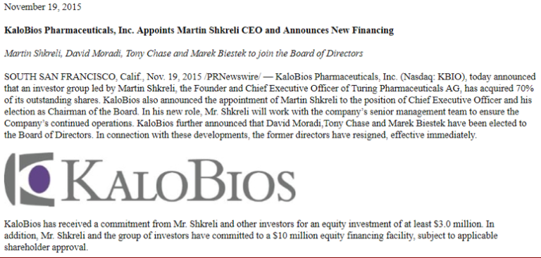 - KBIO Appoints Shkreli CEO, Announces New Financing (KaloBios Press Release, Nov. 19th, 2015)