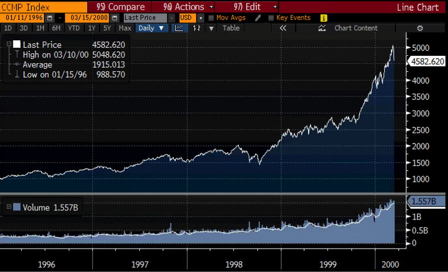 Take a good look at the chart below showing the NASDAQ from 1996 to 2000. And then ask yourself this: How sure are you that we are now currently in December 1999 rather than December 1996 ?