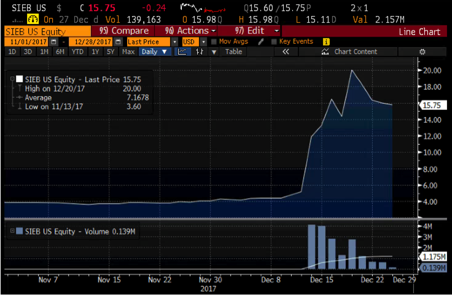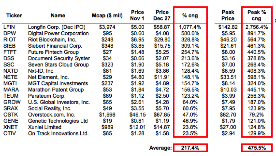 Below is just a partial list of recent share price moves tied to some sort of crypto or block chain news. These share price moves all occurred since November 1st. The average peak move for these stocks is a staggering 475.5% gain in just that seven weeks !