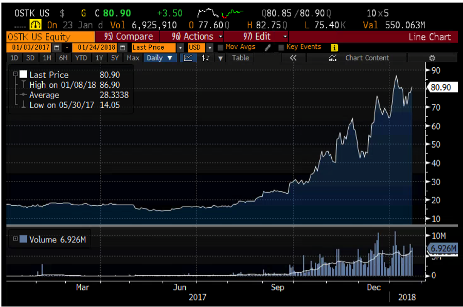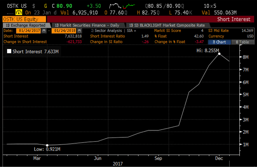 - As of December, short interest in OSTK hit 42%. Latest data will be released after market close today. Given recent activity, I expect short interest to hit 50-60%.