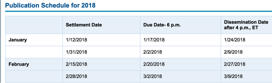 Below are the short interest publication dates for each of the various settlement dates listed, along with a Bloomberg table showing the recent rise in short interest to over 40% of float in Overstock.