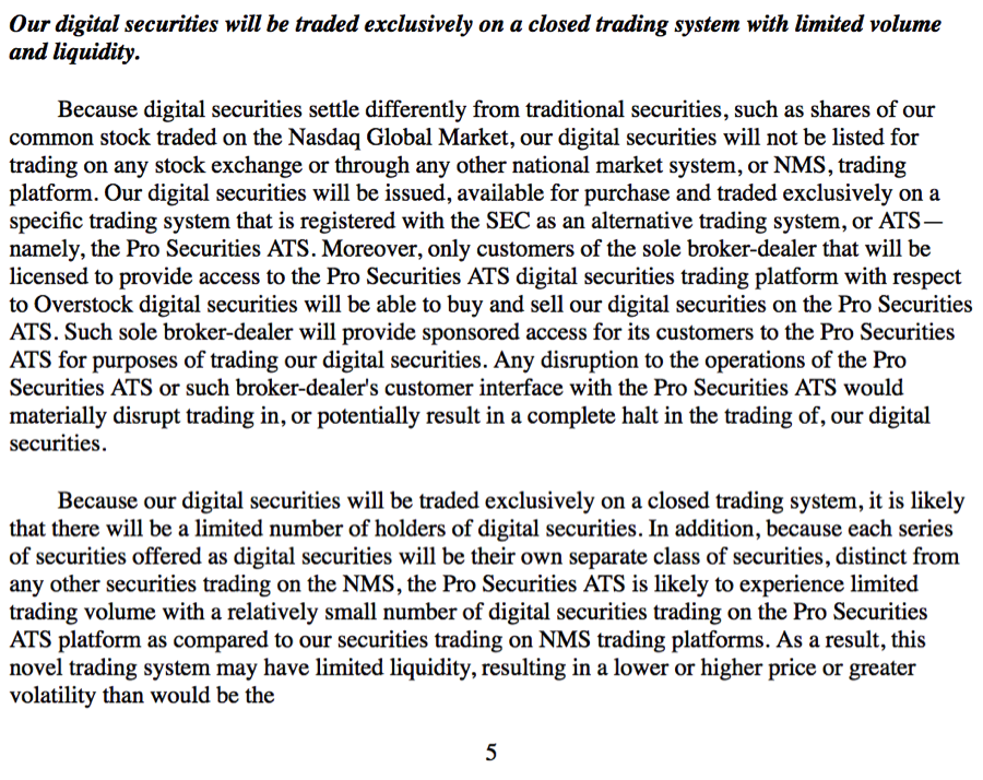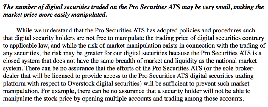 Even Overstock itself has specifically disclosed the easy potential for the outright manipulation of such “digital securities” as a result of their limited liquidity and the fact that they will trade on a “closed system” via just a single broker dealer.