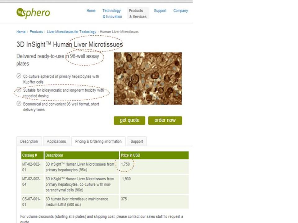 Important Note: The market data with respect to pricing and volumes of 3D liver assays should be seen as highly verifiable. This is how investors should estimate future revenue prospects. Links are included so that they can be verified by anyone. For investors who wish to conduct their own checks, I strongly encourage them to ask Organovo management directly about expected prices and volumes. Management can be reached at [email protected]. Alternatively, investors can ask other 3rd party sources such as Zacks analyst Jason Napodano who has covered the stock or companies such as Insphero (shown below) which already sell 3D bio printed liver assays. These sources will yield estimates that should all be very much in line with the ones I present below.