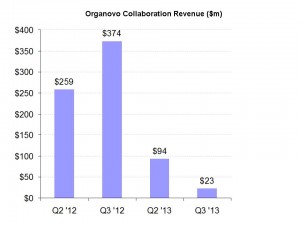 This should be readily apparent by looking at the amount of collaboration revenue which has been steadily dwindling each quarter. As of the most recent quarter, Organovo brought in just $23,000 in collaboration revenue. By contrast, in 2012 the total for the year was over $1 million.