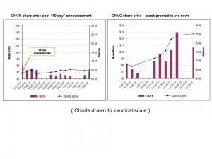 ONVO went public at $1.65 per share on February 14, 2012 and experienced some impressive momentum out of the gate, climbing to $3.01 (an 82% increase) by May 17. That’s when things really went crazy. Just one month later [IN JUNE 2012], ONVO traded as high as $10.90 (a 560% increase from the close on its first trading day just four months prior) after some of the larger newsletter companies like Motley Fool wrote numerous positive articlesabout the company and helped propel it to a $500-million market cap (despite no change in fundamentals) virtually overnight.